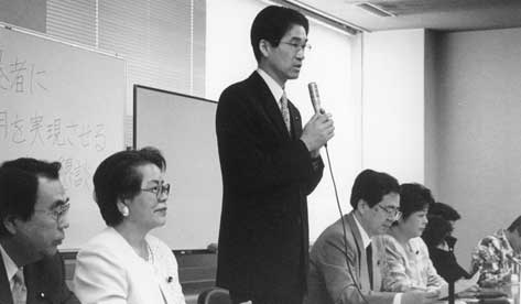 「原爆投下後五十五年目を迎えようとしていますが、日本の国内においては被爆者援護法が成立して被爆者行政が進んでおりますけれども、日本の国内を一歩出ますと、援護法が適用されないという問題が長く大きな課題として残っております。この問題はなんとか解決すべきでありまして、被爆者の方々が高齢化されるなか一日も早く解決しなければならないということで、超党派の議員で話しをしていただくなかで、国会のなかに議員懇談会をつくりたいということで、今日発足することになりました。