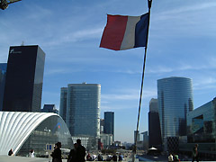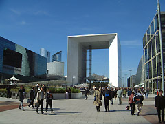 フクオカさんが借りたアパートは、日本でいえば銀座地区のど真ん中にあるようなもので、パリ都心ならほとんどが徒歩圏に入ってしまう交通至便な場所にある。空間的なゆとりもアパートならではのもので、日本人向けに炊飯器まで備え付けられている。これで、これまで泊まってきたホテルと大差ない費用で借りられるのだから、滞在期間が一定の日数になるときは、現地のアパートを借りたほうが都合が良さそうだ。 郵便局へ寄って日本宛の手紙を何通か出し、ネットカフェのマダムに挨拶を済ませ、午後3時過ぎにギャラリーに戻る予定でフクオカさんと別れた。パリ市の西方に位置する新市街のラ・デファンス地区に行き、最後はカルチェ・ラタンに寄ってパリの大学を見るつもりだ。 ラ・デファンス地区は、さして珍しくもない高層ビルが立ち並んでいるだけであり、歴史が積み重ねられた旧市街と比べると(観光的に)見るべきものは新凱旋門くらいしかない。でも、私はパリに来る前から新市街を見に行こうと決めていた。 フランスは、芸術と料理だけの国ではない。技術と経済の国でもある。フランスの持つ技術力は世界に冠たるものがあり、その経済力も大きなものがある。統合市場ユーロの覇権争いも絡み、近年におけるフランス企業の世界戦略はますます拡大しつつあり、その影響は日本にも及んでいる。例えば、ルノーによる日産の事実上の買収、アルテミスによるあおば生命の買収、カルフールやセフォラの店舗展開など、フランス企業の日本進出が盛んになっているが、これもフランスの世界戦略の一部に過ぎない。フランスという国家の底力を垣間見るためには、フランス一のオフィス街であり、同時にヨーロッパ一のオフィス街でもあるラ・デファンス地区はどうしても見ておきたかったのだ。