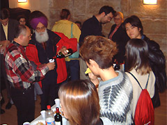 ようやく準備も整った頃、ぽつぽつと人が集まり始め、オープニングパーティーが始まった。佐藤さんが多くの方に呼びかけをされていたこともあり、おそらくフクオカさんもこれほど集まるとは予想していなかったと思われるほど大勢の来客で賑わった。ギャラリーの隣に特設されたパーティー会場はたちまち満員になり、ギャラリーの方まで人があふれるほどであった。私もいろんな人に挨拶を試み、写真も撮って回った。割とよく話をした青年が(話したといっても通訳を介してだが)、近いうち日本にやってくるという。ジブリ美術館にも寄りたいそうだが、今のところ海外からは予約できないので、私が代わりに確保しておくことになった。 いろんな人と話が出来るまたとない機会なので、心の中では張り切っていたが、片言のフランス語とジェスチャーだけはやはり限度があった。結局、まともに話をすることが出来たのは、日本語か英語を話せる人だけであった。他の人とは周りの人に通訳の支援をお願いしなければ会話が成立しなかった。これまでは、話せようが話せまいがガシガシやってきたのであったが、今さらながら語学力の不足を思い知らされることとなった。再びフランスに行くときはきちんと話せるように勉強しておこう。 それにしても、オープニングパーティーは盛況だった。みんな熱心に絵に見入り、パソコンから再生されるCD-ROMの音楽に聴き入っていた。めげぞうは、特に女性に人気が高く、マドモアゼルからマダムまで、めげぞうを手にとっては受けまくっていた。談笑の輪があちこちで出来、ひとつの社交場が生まれていた。お世辞でも何でもなく、イバラードが世界に広がっていくのを実感せずにはいられなかった。 あっという間に閉場の時刻になり、名残惜しいままホテルへと引き上げた。さすがに疲れた・・・。 | |||||