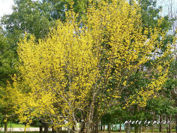 | 6:ほぼ同時に「サンシュユ」の開花も始まります。(3月下旬) ロールオーバー:画像上をマウスON・OFFで全体開花とそのマクロ花が交互に現れます。(3月下旬) |