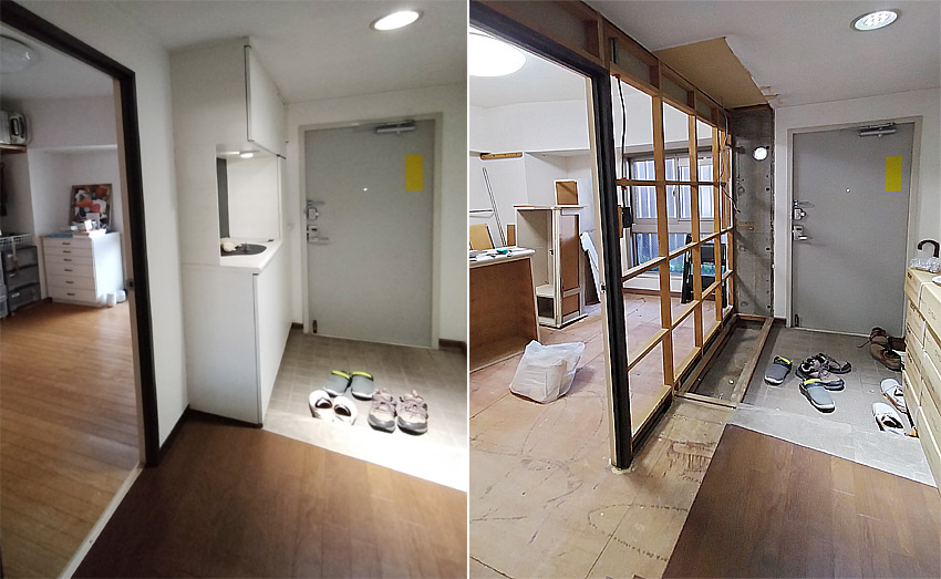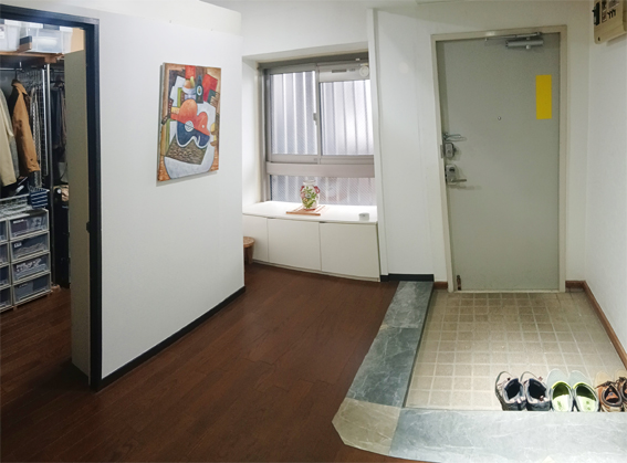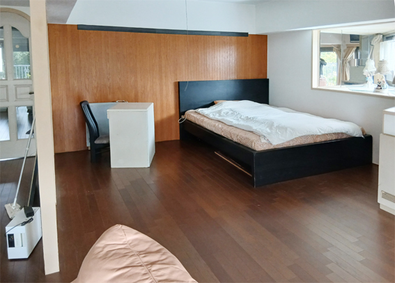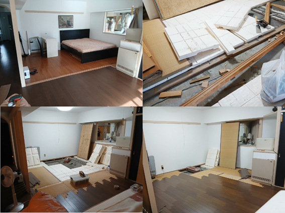 | 2025年8月1日 今回はやるかやらないか迷っていたところ、 使用していたフローリング材が今年の3月で ディスコン。九州の業者にわずかにあること が分かり、73歳、実施を決断。 友人たちが遊びに来ると玄関の狭さを痛感。 ほぼ、納戸扱いになっている隣室との壁の変更、 リビングに続くベッドフロアのフローリングを変更。 |