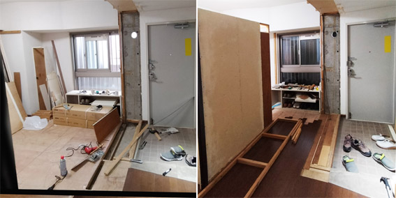 隣室はカーペットを剥ぎフローリングへ。 カーペットは裁断して普通ごみ処分。 崩した壁の石膏ボード、木材は再利用。 |