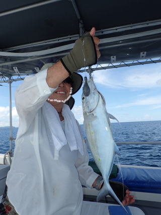 左の魚は、ボトムフィッシングでの釣果の尾長です。体長約80センチ、パラオで一番おいしい魚だそうで、レストランに持ち込んで刺身と甘辛い煮魚で食べました。 因みに2番目に美味しいのは、いわゆるナポレオン・フィッシュだとのことですが、現在は捕獲も食べるのも禁止されているそうです。