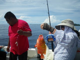 左はいつもお世話になっている現地スタッフが釣り上げた大物です。これは、夕食のレストランに持ち込んで料理して貰いました。