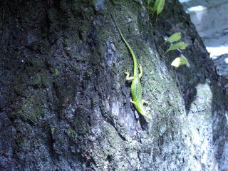 2日目のボート・フィッシングの昼食は、猪木アイランドの休憩所でした。 前の海の中にはこんな形のナマコ(25センチぐらい)が沢山いました。 また、休憩所の前の木の根っこに緑色のトカゲが木から下りてきていました。
