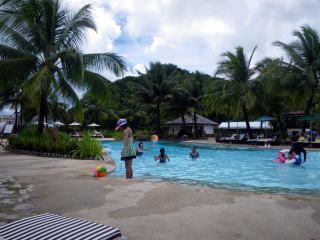 左下の写真は、炎天下のパラオを少し歩いて、ホテルの前の海沿いに海の反対側から島影になるホテルの遠景を写しました。右側の写真はホテルのプールサイドの写真です。