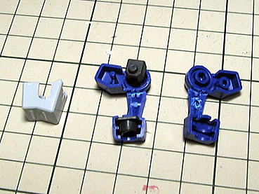 | 第2弾です。青いパーツはそのままに白いパーツを2分割します。 左側の下の爪は残しておきます。手首のポリキャップを押さえる為です。 |