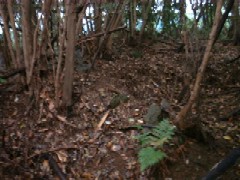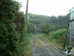 伝・三成陣跡・入口 三成陣跡の入口です。金網で仕切られた蜜柑畑の 向こう側の藪の中に陣跡はあります。 私有地なので、立入には地主さんの許可を貰ってくだ さい。 |