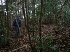 伝・三成陣跡・土塁(その2) 人物の横にある盛り上がったところが土塁です。 かなり崩れてますが、高さは0.5〜1m程です。 |