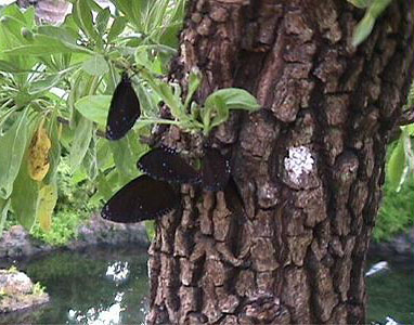 いやー、、決死の撮影であった。 と言いたいところなんですが (^^;; 実はジャングルとは 大嘘で、蝶の群れ飛ぶ場 所はホテルの庭であります。木の下に見える 人工の池には沢山錦鯉が泳いでます。