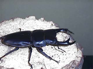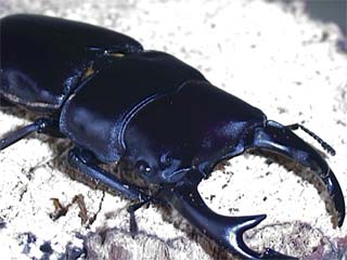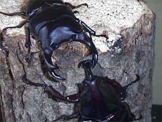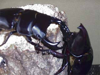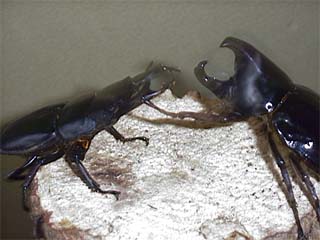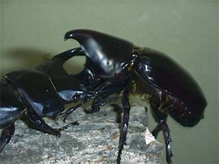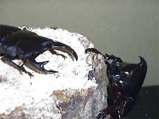 今度は国産オオクワが先ほどの勝者キングオブギデオン に挑戦する。 オオクワは72ミリのガッチリタイプ。 長さではギデオンに引けを取らないがオオクワの 技がギデオンにどこまで通用するのだろうか? ギデオンのパワーと闘争心を見せつけられているだけに オオクワの身を案じてしまう。 ![]() ![]() 試合は静かに始まった。 レフリーにけしかけられたオオクワは、大顎を大きく開き やや体を起こして踏ん張っている。 そこにギデオンの先制パンチが炸裂。 しかし全然効いていない。それどころか オオクワの怒りを買っているだけの様だ。 怒ったオオクワは前にも増して立ち上がり踏ん張る。 しかし、危ないぞ!オオクワ!! その体制でギデオンに攻められたら投げられるだけなら未だ 良いが、下手すれば背中に大穴が空きかねない。 ![]() 先ずオオクワが近づいた。 ギデオンは激しくオオクワの大顎の下に突進した。 危ない!! と思ったその時、オオクワはギデオンの頭部の角を上から 挟み込んだ。 体制的にはギデオンが有利。そう見ていたのだが何とオオクワは ギリギリと挟み直しギデオンの頭部までガッチリと強く挟むと、 そのまま前に強引に押し込んで行くではないか! オオクワは押し込むだけではなく、挟んだまま上にも持ち 上げている。 このパワーはかなり強烈な様で、ギデオンの頑丈な足を持ってしても 踏ん張りきる事が出来ずに体が浮き上がってしまった。 ![]() これにはさすがのギデオンも引くしか無く、一旦離れた。 ![]() ギデオンが攻めようとしてもオオクワは全く隙を見せない。 ![]() ギデオンは何度も攻めようと攻撃を仕掛けるが、 オオクワの挟み込みと大顎で上部にはじく動作に阻まれ 近づく事も出来ない。 ![]() ここで一時ブレイクとなり、違う角度で再戦となった。 しかし、結果は全く一緒。 押しも持ち上げもギデオンはオオクワに全く歯が立たなかった。 ![]() やがてギデオンはオオクワに挟まれ押され、ギイギイと 悲鳴をあげながらひたすら後ずさりするだけになってしまった。 しまいには体が離れるやいなや一目散に逃げ出す始末である。 そしてその後はもう二度とオオクワには立ち向かわなく なってしまった。 この勝負は、技、パワー共に圧倒的にギデオンを上回る 国産オオクワの勝ち! |
