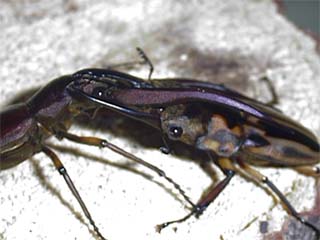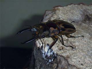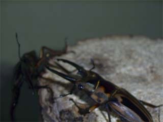 今度も心配な試合だ。 さっきのメタリフェルが又出てくる。 それだけではない。 ゼブラは人の気配を感じただけで全ての足を引っ込め すぐポロッと落ち、大顎の間に指を入れても挟まない 平和主義者であるからだ。 ![]() 予想通りの展開だった。 やはりゼブラは言うことを聞かなかった。 リングに上がってもすぐに降りてしまうのだ。 さすがのメタリフェルも腹が立ってきたようで 時折大顎を振りかざすようになった。 これでゼブラがやる気を出せばいいのだが。 そのままきっと終わってしまうと誰もが思ったていたのだが、 相手に気づいたゼブラはリングにとどまり、じっとメタリフェル を見据えた。 メタリは長い大顎でゼブラを上から挟んで投げ飛ばそう とした。が、しかし、そこをかいくぐってゼブラが突進。 がっぷり四つに組む。 ふところに入られたメタリフェルはやりにくそうだ。 メタリフェルより体の小さなゼブラが攻めだした。 ギリギリと力強く何度も挟み、強引に押していく。 足の細いメタリは踏ん張りが効かないのかじりじりと後退する。 ![]() とうとうゼブラがメタリをリングの外に追いやってしまった。 メタリはすぐに戦意喪失。逃げ出してしまった。 ![]() この勝負、寄り切りでゼブラの勝ち。 |