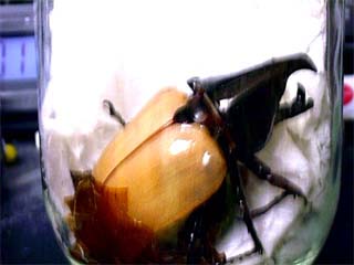 3.ボルネオのギデオン ギデオン。 なんだか強そうな名前だ。 まるでスーパーロボットのような名前で無限の力を感じてしまう。 ボルネオの友人宅でそのギデオンが蛹化、羽化したので報告する。 幼虫は前に紹介したがちょっと毛むくじゃらで国産カブトより一回り大きく良く動く。蛹もやや大きめで、蛹室は縦でなく斜めに作る。 人工蛹室はそれに習って斜めにしたが、ワンカップで縦の人工蛹室でも問題なく羽化する。
