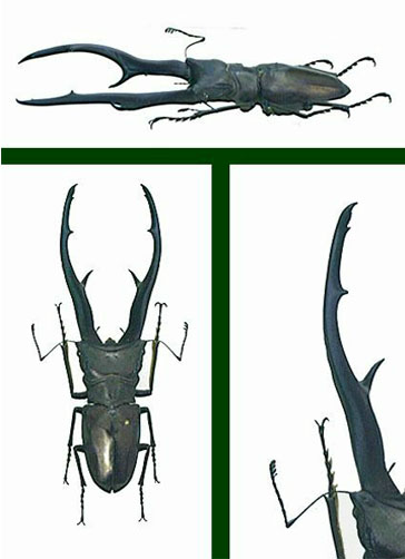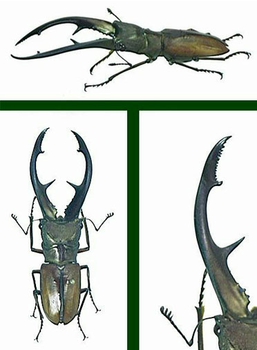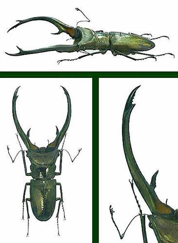 Cyclommatus elaphus Gestro,1881 分布 スマトラ 体長 ♂ 35−102mm ♀ 35mm Cyclommatus属の最大種で100mmを越える。体色に はやはり変化が多く茶系統のものから全身が金属緑 色になる綺麗な個体もいる。大顎のカタチは個体の 大きさの違いなどで著しく変化し別種と思えるほど 変わってしまう個体もある。スマトラ島に広く分布 すると言うが南部の多産地(Mt.Dempo)が知られる 以前は殆ど日本に入って来ないクワガタだった。北 部では現在も少数しか採集されない。南部の多産地 では主にライトトラップで採集されると言うが、90 mmを越える大型はやはり何百頭中の少数しかいない と聞く。この種の100mm近い大型個体を初めて見た 時にその金属緑色に輝く豪華さと大きさに感激した。 標本 Mt.Dempo S.SUMATRA April/1992 ♂ 97mm