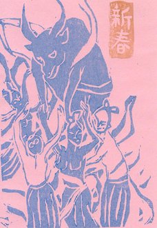 ノリで一気に彫り上げた作品です。 何も考えずに無心で彫りました。 「豚もおだてりゃ・・」の例え話のように この牛もきっとおだてられたのでしょうね。 天女さんの羽衣を借りて、空へ・・・