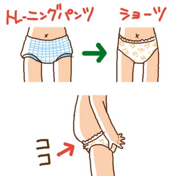 | トレーニングパンツと違ってもこもこしていないので、 おしりの形にぴったりして、触るとおしりの感触が とてもよくわかります。(さわりまくり←変質者のよう・・・) 商品名も「ショーツ」だし、何だか一人前に見えて、 ちょっと感動♪ でも、おなかがぽってりしてるので、どうしても ゴムの部分が下の方にずれてしまうのでした。 |