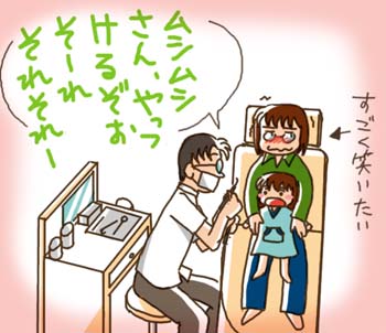 | 今通っている歯医者さんは小児歯科ではないけれど、 おもちゃや絵本が置いてあったりして、 むすめはかなりお気に入りです。 なるべく怖くないように痛くないようにしてくれるのは いいんですが、先生がむすめに話しかけるときの 言葉がおもしろすぎて、わたしはいつも笑いを こらえるのに大変・・・。 |