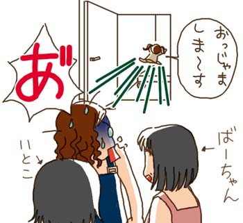 | 途中で保育園からいとこの娘さんが帰ってきたのですが、 うちのサルのあまりの傍若無人ぶりに 無言で呆然と立ちつくしてしまいました。 帰ってきたら、知らん奴が自分のおもちゃを 部屋中散らかしているのです。無理もありません。 |