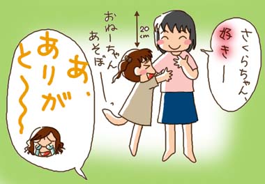 | 脱いだ服もきちんとたたむしっかりものの 娘さんは、一緒に遊んでくれた上に こんなうれしいことまで言ってくれました。 その節は大変お世話になりました。 懲りずにまた遊んでください・・・。 そして、さるっ!! 図々しいにもほどがあるぞっ!! ◆ 身長差が20pもあるため、よけいに お姉ちゃんにみえました。 いとこの子供同士って何ていうんだろう・・・? はとこ?またいとこ? |