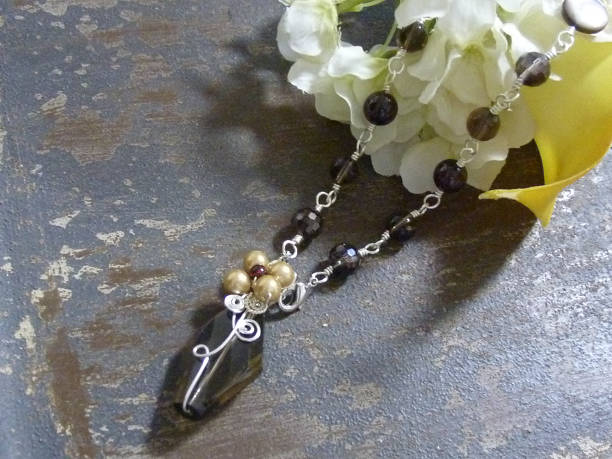 | 8月講習 スモーキークォーツのネックレス スモーキークォーツ、ガーネット シェル 他使用 講習料 2376円 材料費 1800円 |