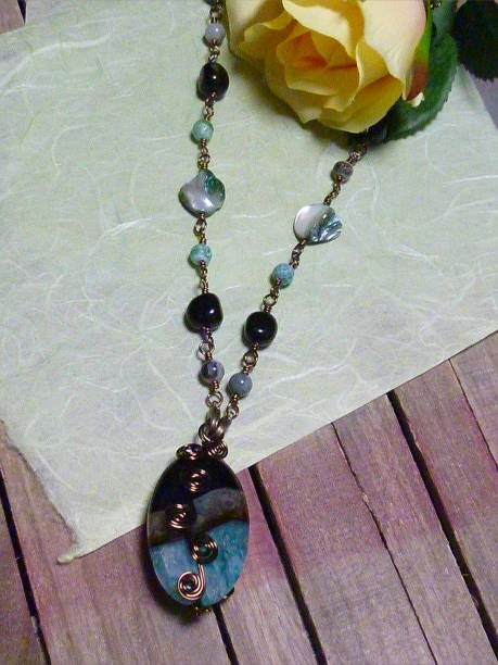 | 10月講習A ネックレス〜アゲートのときめき アゲート(染) イーグルアイ オニキス シェル チェコビーズ使用 講習料 2000円 材料費 2000円 |