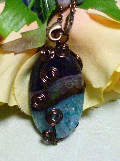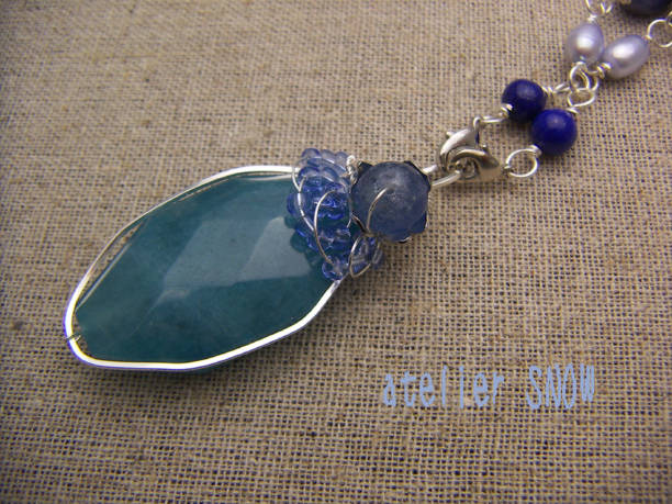 | 10月講習@ 蒼いアゲートのネックレス アゲート(染) カットガラス フローライト チェコビーズ使用 講習料 2000円 材料費 1700円 |