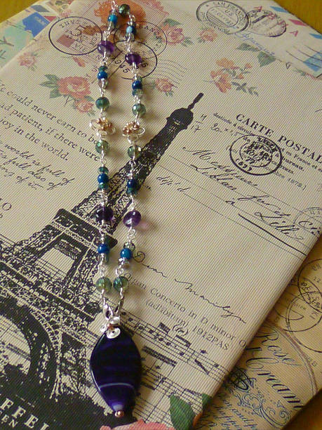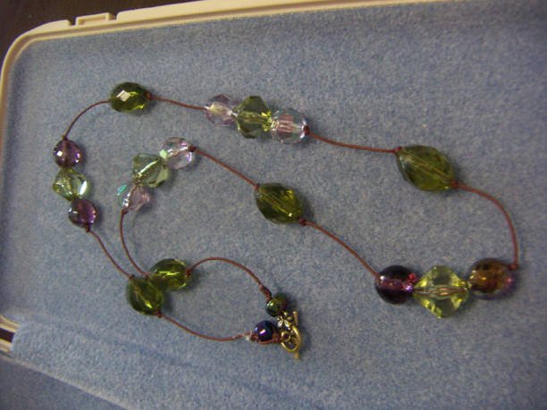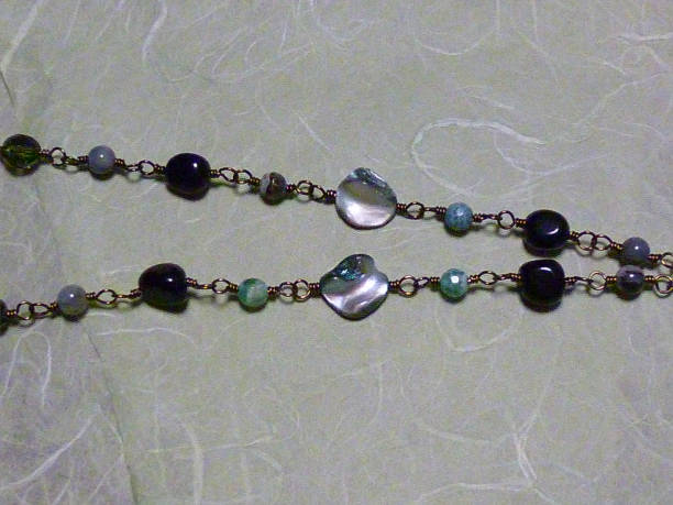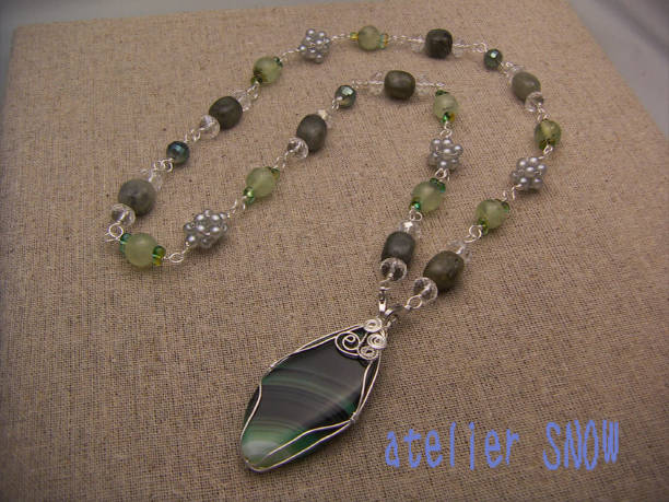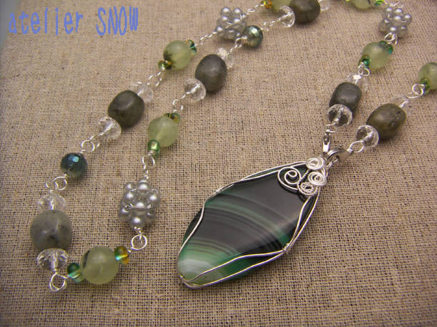 | 4月講習A ネックレス〜眠れぬ森 アゲート(染) ラブラドライト プレナイト カットガラス ファルファーレ アクリルビーズ 講習料 2000円 材料費 2000円 |