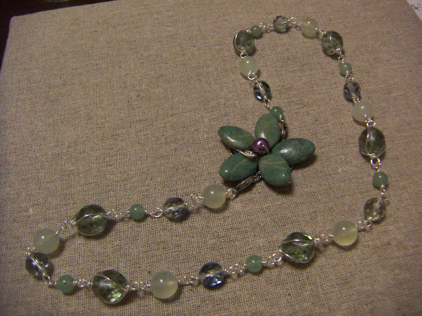 | 1月講習@ オリーブのお花のネックレス グリーンプラセ、サーペンティン、 アベンチュリン、チェコ使用。 講習料 2000円 材料費 1800円 |