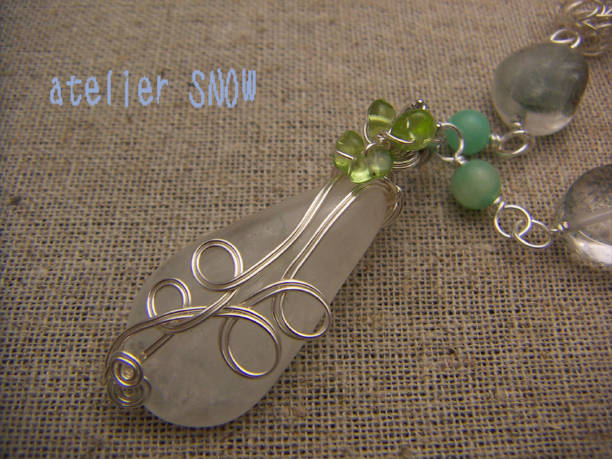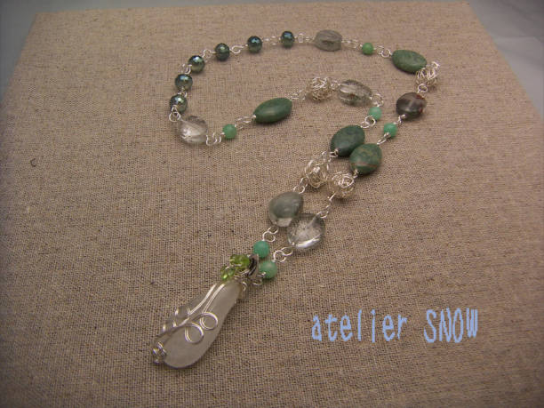 | 3月講習@ ネックレス〜春のそよ風 グリーンファントムクォーツ ペリドット ヘミモルファイト ガーデンクォーツ グリーンブラセ カットガラス 使用 講習料2000円 材料費1900円 |