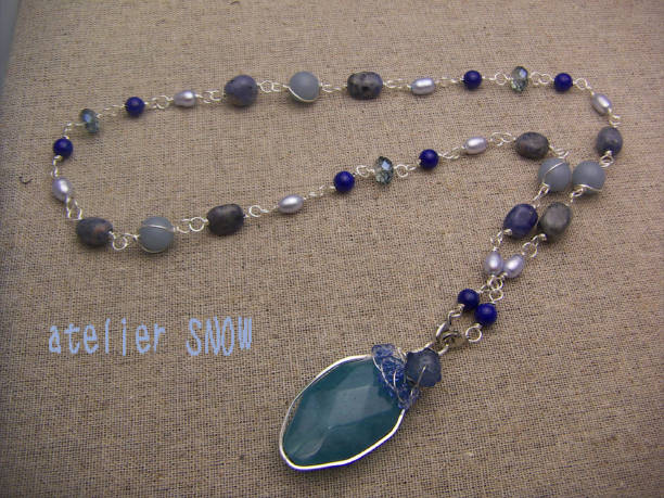 | 3月講習A 深い海のネックレス クォーツ(染) フローライト ソーダライト エンジェルライト 淡水パール 使用 講習料 2000円 材料費 1900円 |