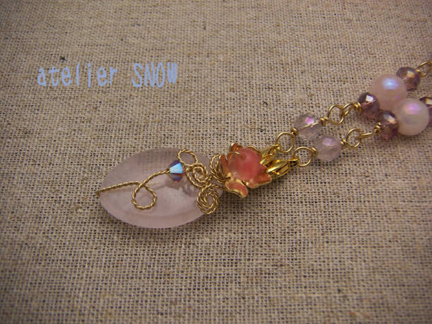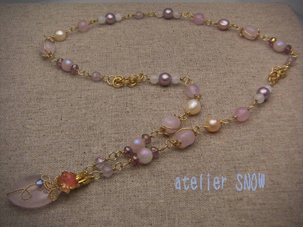 | 4月講習@ 淡い春のネックレス ローズクォーツ スワロフスキー チェリークォーツ オーララベンダーアメジスト オーラローズクォーツ カットガラス 淡水パール ピンクアゲート ムーンストーン チェコ使用。 講習料 2000円 材料費 2000円 |