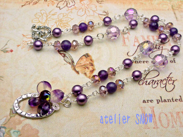 | 9月講習@ サクラ咲くネックレス ラベンダーアメジスト 淡水パール スポンジサンゴ カットガラス メタルフラワー チェコガラスパール チェコ 講習料 2000円 材料費 1700円 |