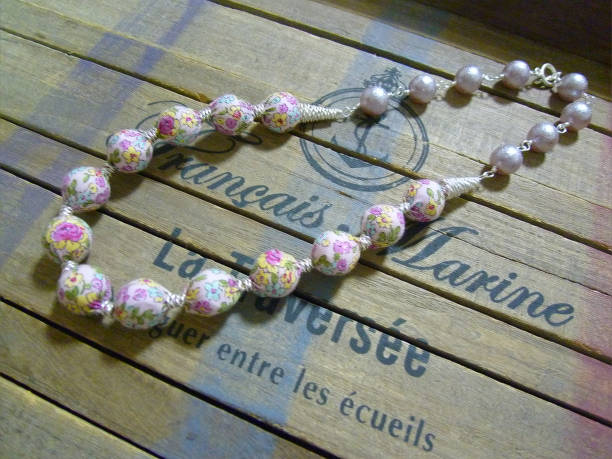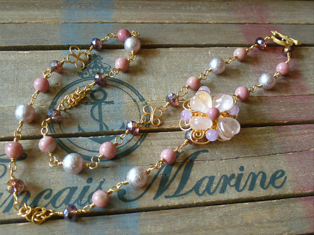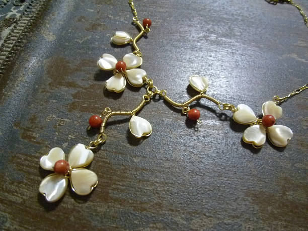 | 8月講習A 小沼美紀先生の お花のネックレス シェル、スポンジ珊瑚ご使用 講習料 2000円 材料費 1700円 こちらは、小沼美紀先生 デザインの作品となります。 講習には先生の書籍 「WIRE_BEADS ACCESSORY ART WORKS」の購入が 必須となります。 石&ワイヤーをサンプルから お選びいただきます |