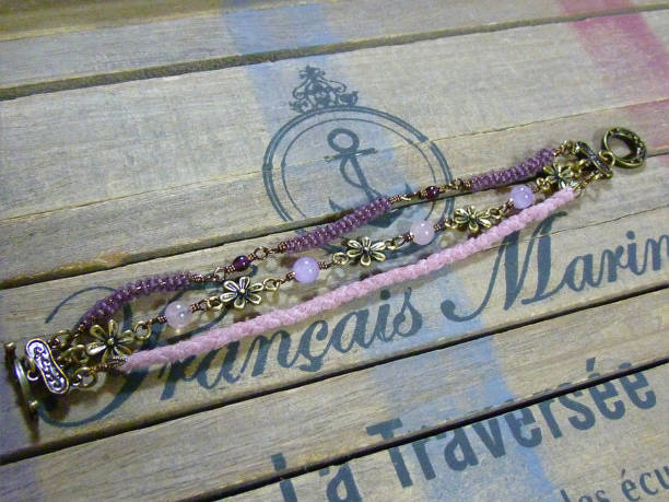 | 5月講習@ 三連のブレスとピアス ラベンダーアメシスト ローズクォーツ。 スワロフスキー他使用 ※ターコイズに変更できます。 ※ピアスかイヤリングを お選び下さい。 講習料 2000円 材料費 2300円 |
