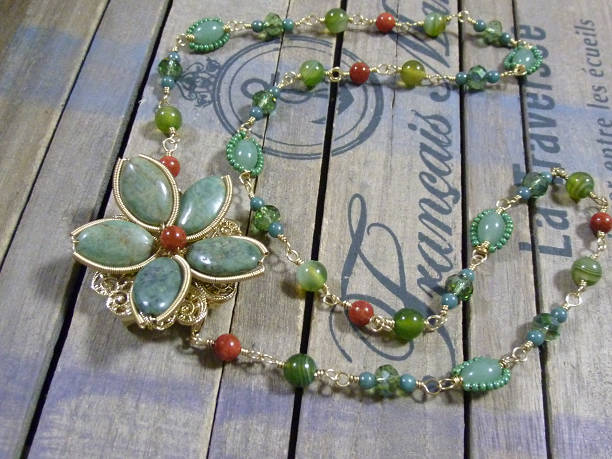 | 6月講習A オリーブのお花3wayネックレス グリーンぶらせ スポンジサンゴ、アゲート グリーンアベンチュリン カットガラス、チェコビーズ使用 ブローチだけでも、チェーン部分 だけでも、組み合わせても 楽しめる3wayです。 講習料 2000円 材料費 2000円 コイリング、めがね留め 応用めがね留めなど使用。 |