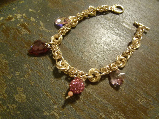 | 8月講習@ ピンクゴールドの チェーンメイルブレス スワロフスキー 白さんご使用 講習料 2000円 材料費 2000円 ビザンチンチェーン、メビウスの輪を 学べます。 とても華やかな作品で バッグチャームとしても 楽しめます |