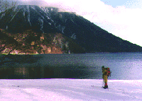 弓張峠からは外山沢川に沿いの緩い斜面を滑降し、西ノ湖で昼食。西ノ湖からは平地滑走で中禅寺湖湖畔の千手ヶ原へ。人気のない湖畔には遊覧船が引き揚げられていて、とても淋しい不思議な雰囲気、。
