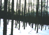 今回、私ははじめてクロスカントリースキーでツアーをやってみました。参加者は7人で、スキー種類はクロカン2人、テレマーク5人です。このコースは初心者でも、とりあえずスキーで歩ければ行けます。とにかく杉林の中が気持ちよい。コンパスと地図を見ながら、自分でルート見つけながら滑りたい。