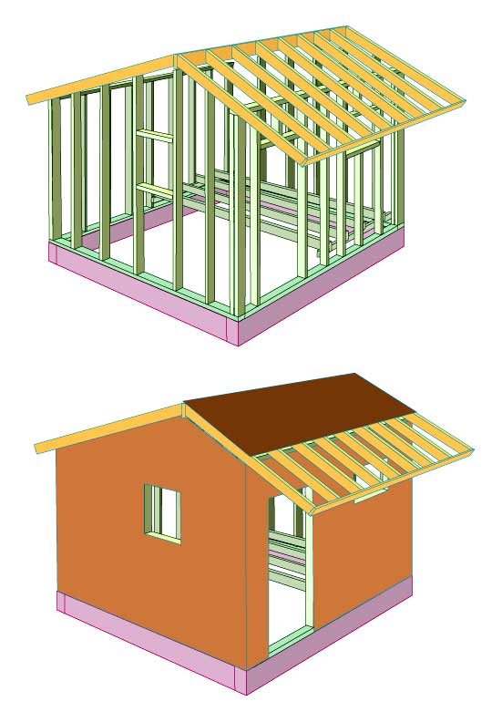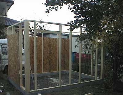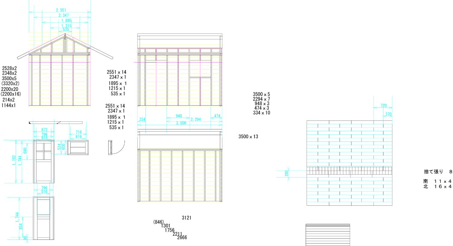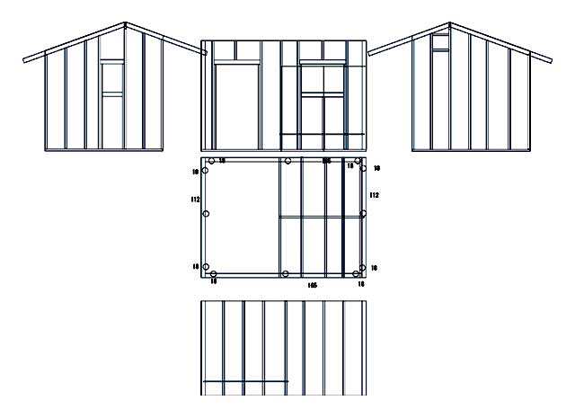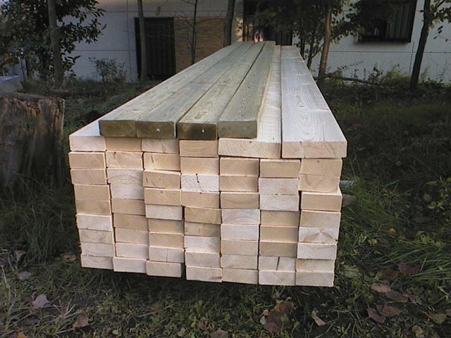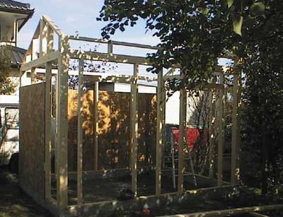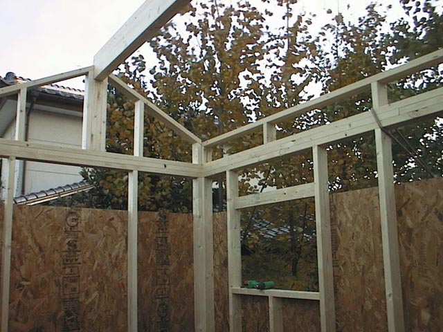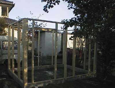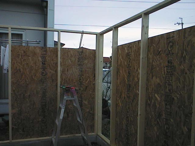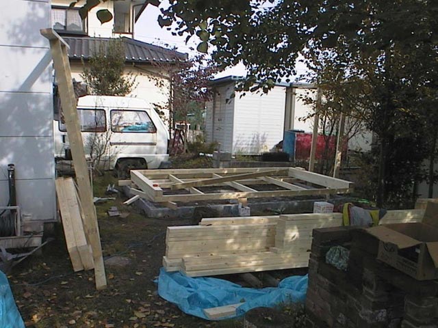 一番下の基礎の部分だけ防腐処理したものをつかってみる。あとはSPFの2x4材。梁だけは2x6だったか。 | ||