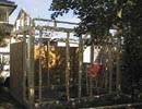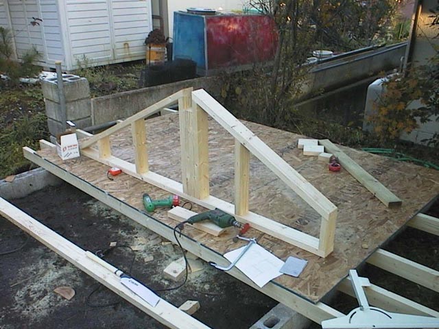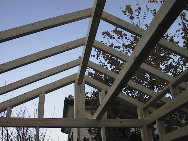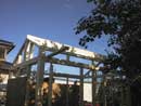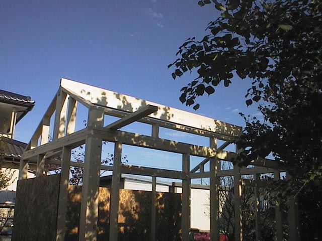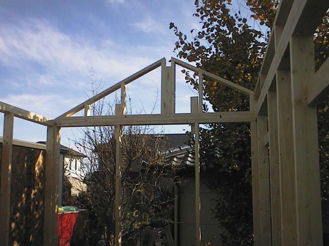 垂木をのせて。 ちなみに脚立はこれ一つ。 |