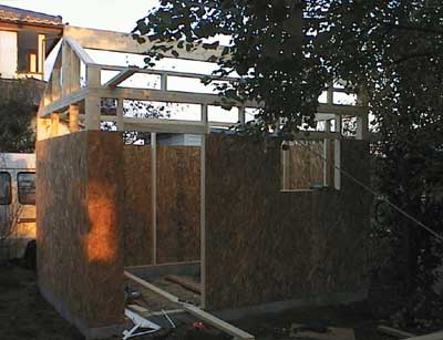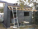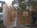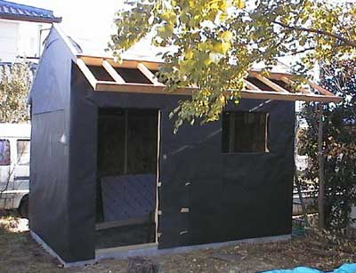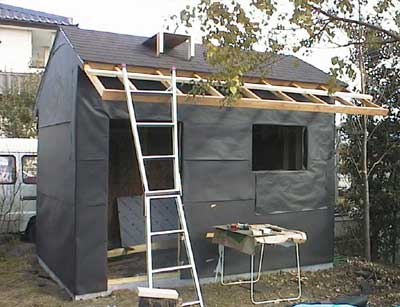 屋根材を張り込みます。 乗っかっているのは作業用台。 |