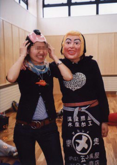 濱ゼミーズなら忘れもしない、このイベント。 我が大学の体育大会!種目は卓球!! 本番当日、濱先生宅に10時集合だったはずが、 集まったのは、おいらと常連組の○村さん。 このとき、○村さんがこのイベントの影の主役になるとは 誰も知りませんでした。あぁ、神よ・・・。 朝にもかかわらず、先生宅では早速 ”山頭火”のカップラーメンと生ビールが手渡されました。 左の写真は、その酔ったいきおいで、 先生が持参した衣装を身にまとったおいらと濱ゼミの姉御。