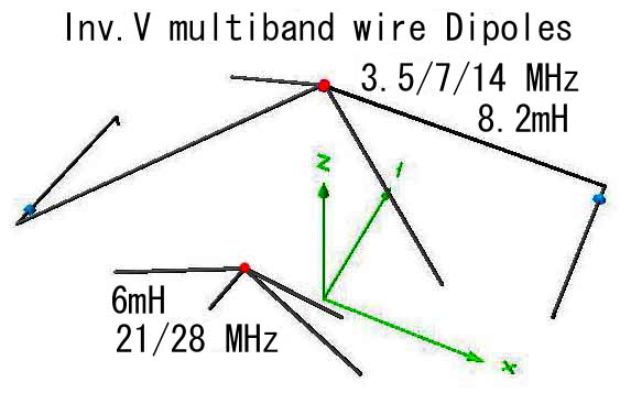 (2)Inverted V Wire Dipole for 21/28 MHz (fed at point of 6m in height)