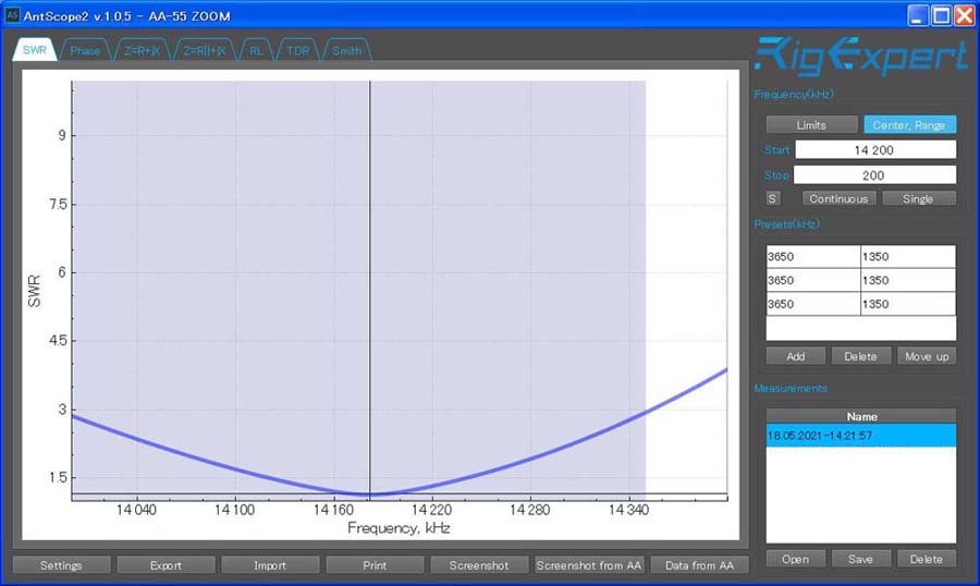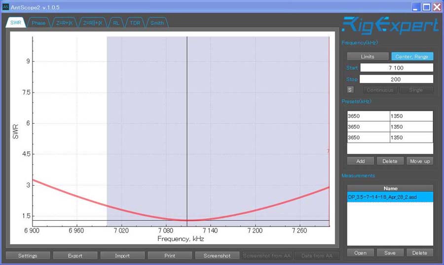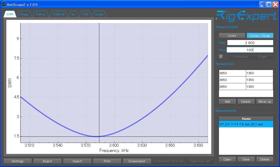 実際に使用しているMulti-band Inverted V Wire DipoleのSWRをアンテナ・アナライザー(RigExpert AA-55 Zoom)