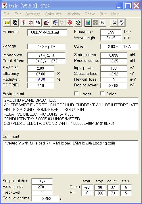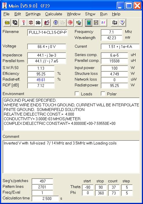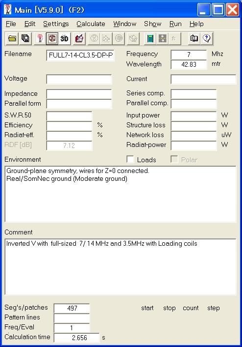また4NEC2ではelementの長さ、位置、角度などを任意の変数として定義することもできる。長さを変数にしてモデルを作り、後でその長さを最適化することも簡単にできる。入力画面も使用説明書も英語で書かれているが、理解は容易である。