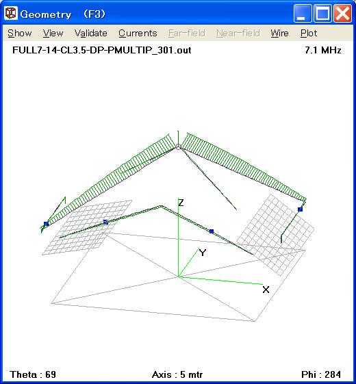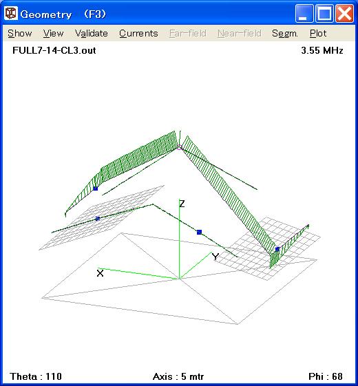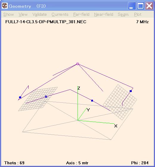 当局の常置場所は街中の住宅地であり、敷地が20mx10m程度しかないこと、及び開局免許時、80歳目前であったこと等の理由で、アンテナ・タワー設置と高性能市販アンテナの利用は難しい。一階屋の屋根の上に、テレビ・アンテナ用屋根馬とポールを乗せ、また破風板へもテレビ・アンテナ用ポールを取り付けて、Wire Dipoleを張るのが殆ど唯一の選択肢である。この故に前ページ記載の様なアンテナをモデルとしてシミュレーションを行った。