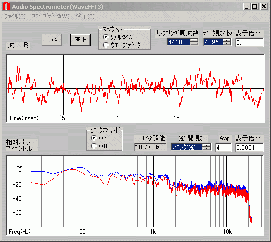 新しいシステムの音場特性自作スペアナを用いて上記システムの音場特性を測った。CDに録音されたピ ンクノイズを音源としてスピーカを鳴らし、音場測定用マイクで拾った音をマ イクアンプ(自作)を通して、パソコンのオーディオ入力端子に導いた。使用 パソコンは富士通 FMV-DeskPower-M5/807 (Windows2000)、測定用音源とマ イクは以下の通りだが、何れも10年以上以前に購入したもので、現在販売さ れているかどうかはわからない。