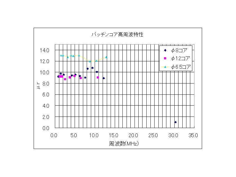 μrの値はφ8とφ12コアでは略10、φ6.5コアでは略12で、周波数15MHzまでほぼ一定である。φ6.5のμrがやや高いが材質の違いなのか、コイル内及びコア内における磁界及び磁束密度分布が異なる故なのか、分からない。何れにせよ、荒い近似の下で計算しており、正しさは保証されない。