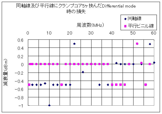 (3-3)同軸線及び平行ビニル線のdifferential mode 電流に対するコアの無効性の確認