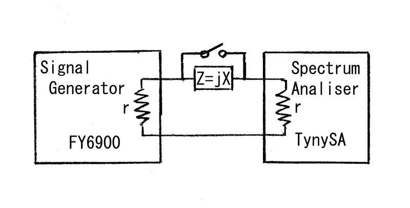 信号発生器の出力インピーダンスとスペアナの入力インピーダンスは共に50Ωと等しいので、負荷を挟んで直結した。